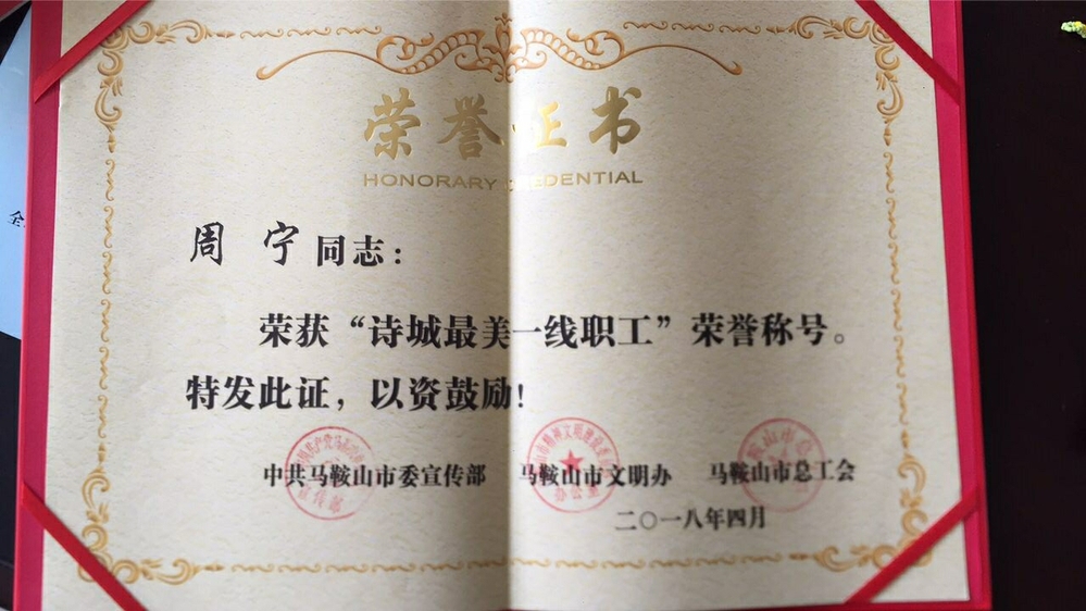 祝贺周宁老师荣获“诗城最美一线职工”荣誉称号