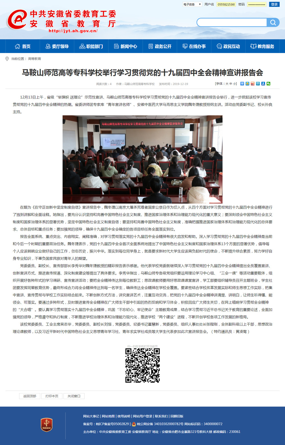 【安徽教育网】BB贝博艾弗森原官方网站举行学习贯彻党的十九届四中全会精神宣讲报告会