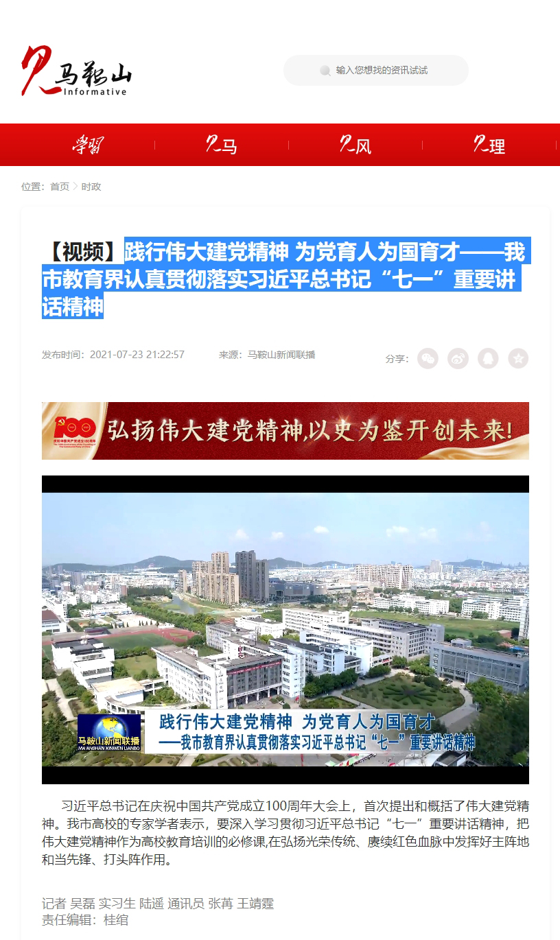 【马鞍山新闻联播】践行伟大建党精神 为党育人为国育才——我市教育界认真贯彻落实习近平总书记“七一”重要讲话精神