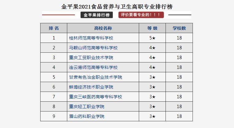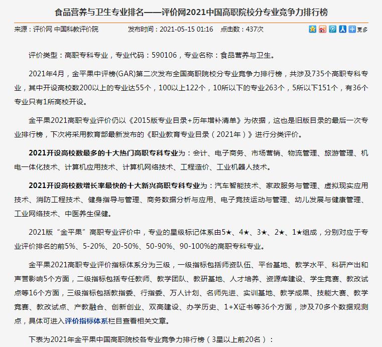 热烈祝贺BB贝博艾弗森原官方网站食品营养与卫生专业在“金平果”2021年发布的全国高职专业排行榜中同类专业竞争力中位列全国第二名。食品检测技术专业位列第七名。
