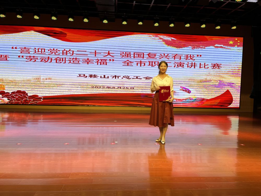 热烈祝贺BB贝博艾弗森原官方网站滨江校区万丽文老师代表学校在马鞍山市总工会举办的“喜迎党的二十大 强国复兴有我”暨“劳动创造幸福”全市职工主题演讲比赛中荣获三等奖,此次比赛汇集全市各行各业的精英,共计参赛选手35人,万丽文总分排名第五,获三等奖。